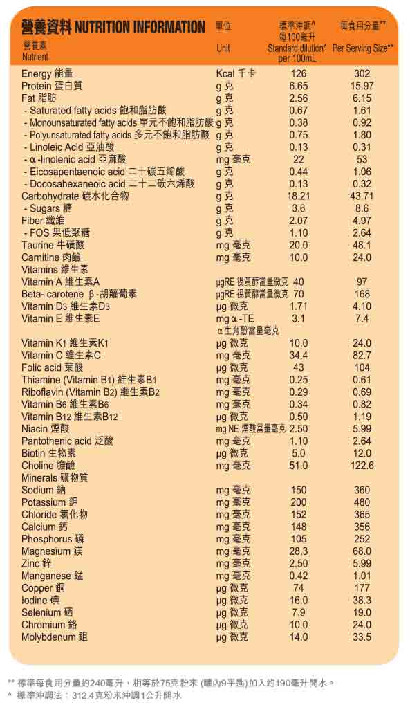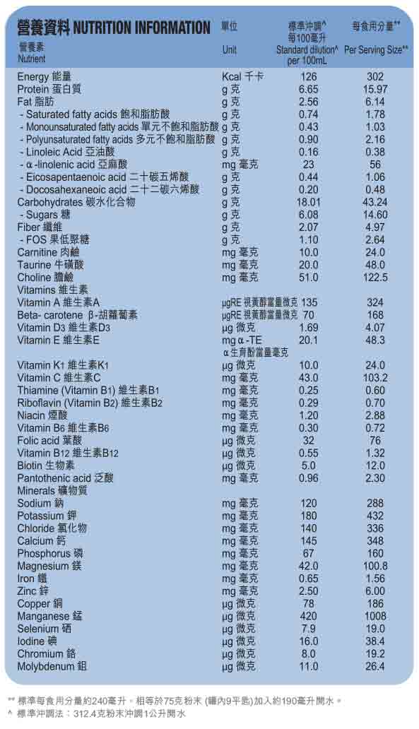 - 24种维生素、矿物质及锌:维生素C及E有助维持抵抗力