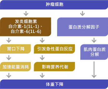 超过半数的患者都会出现如食欲不振、疲惫、呕心、四肢无力和过瘦征状5,主要是因为身体流失了大量脂肪所致,这时候患者可透过日常饮食来补充足够的营养。但亦有很多情况,即使患者已每天摄取大量营养,体重依然不断下降,这情况很大机会是由于癌细胞引致的炎症反应及营养消耗。